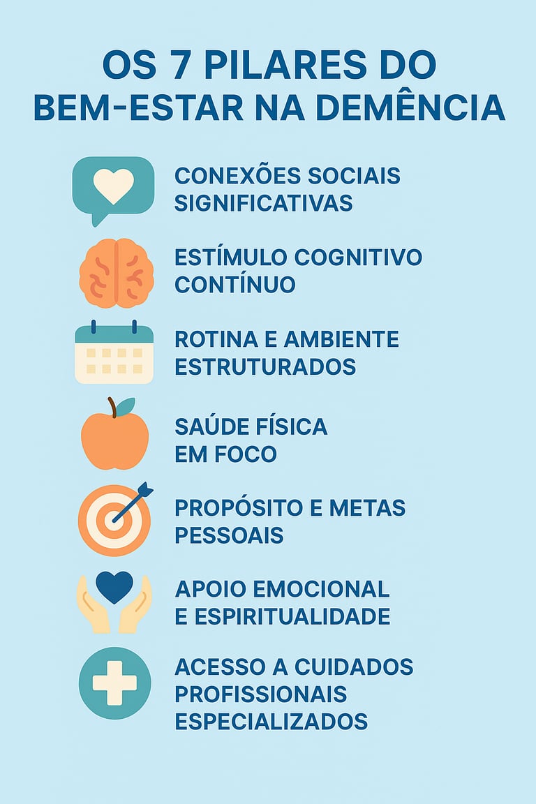 Descubra os 7 pilares do bem-estar na demência e aprenda estratégias práticas para viver com qualidade, autonomia e dignidade após o diagnóstico.